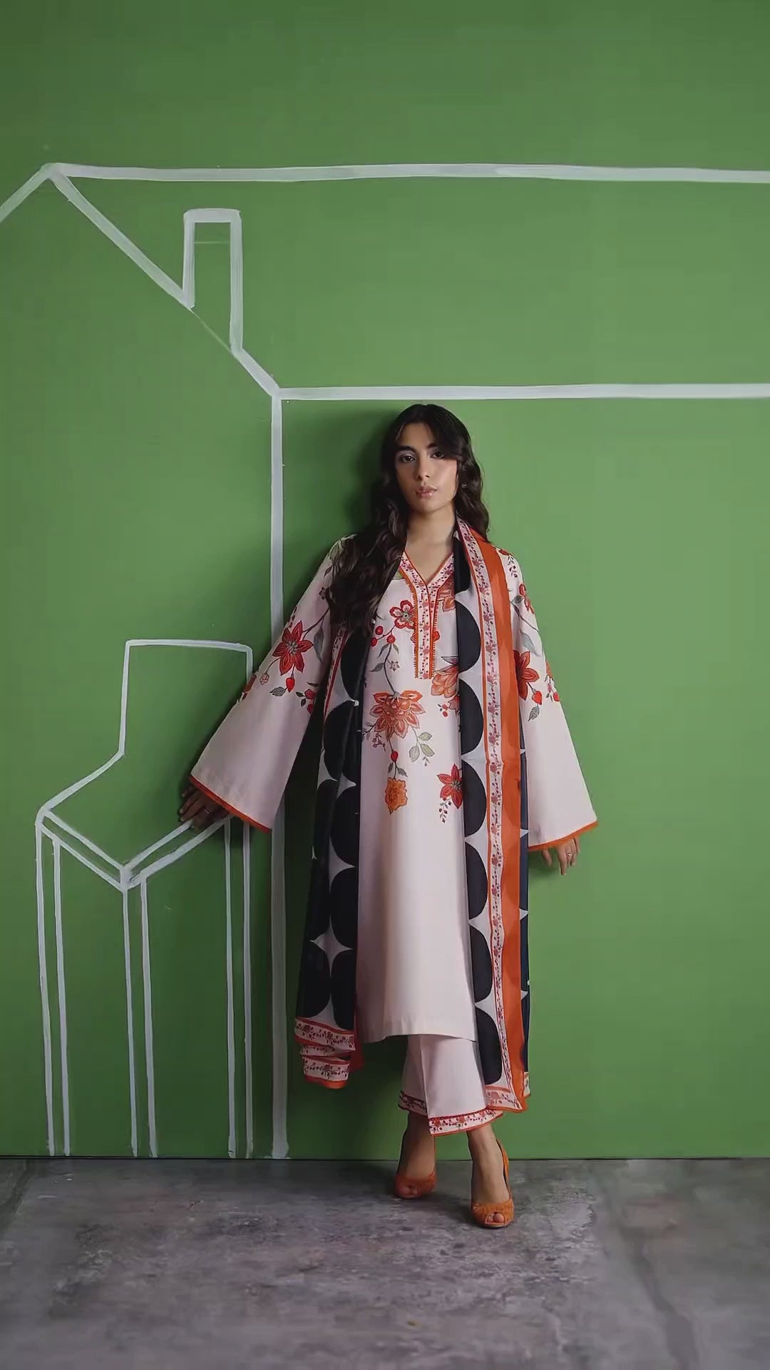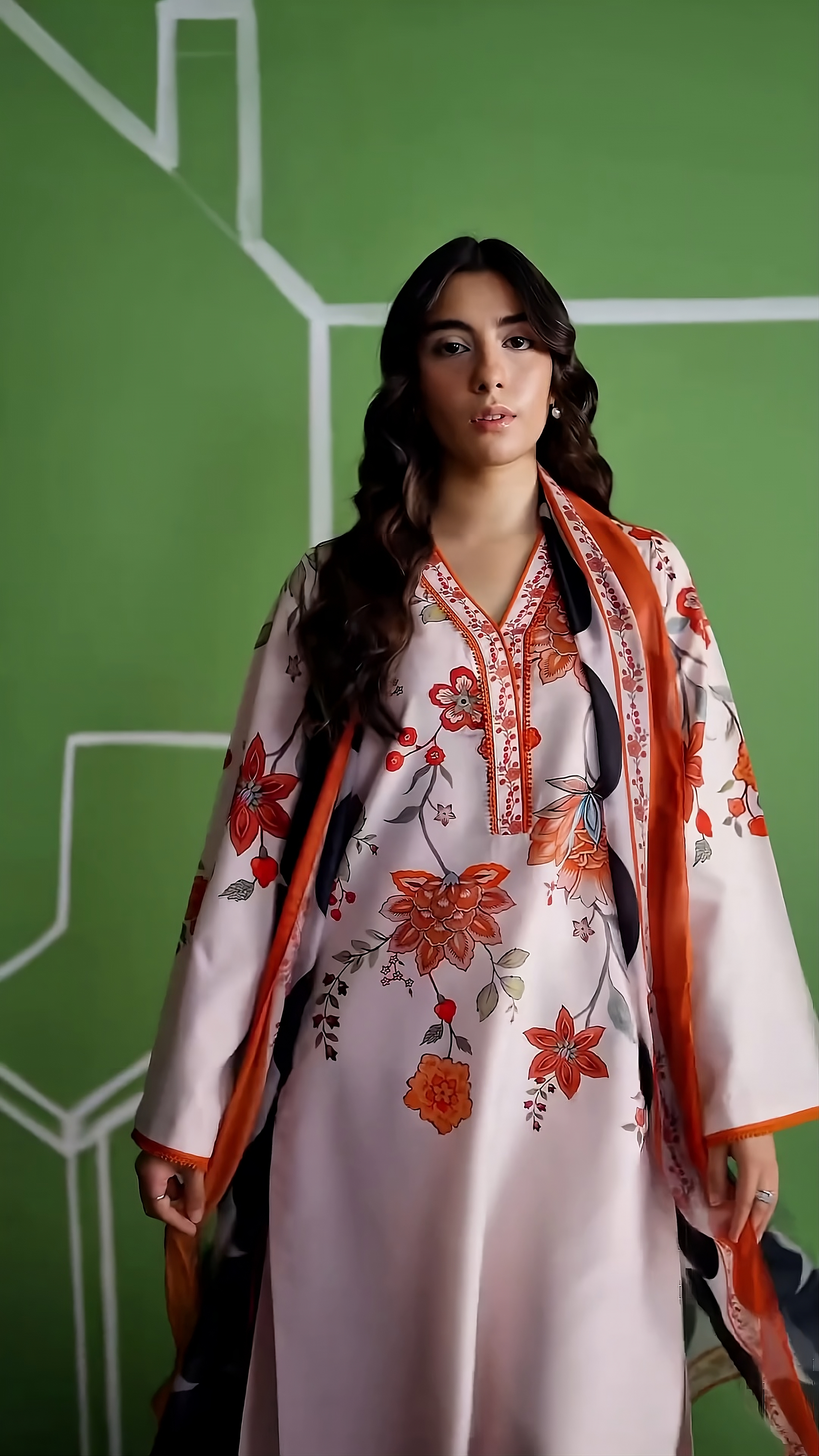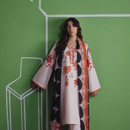 Statement Dupatta: A striking contrast is provided by the lightweight dupatta, featuring a bold, oversized black-and-white geometric pattern with a coordinating floral border.