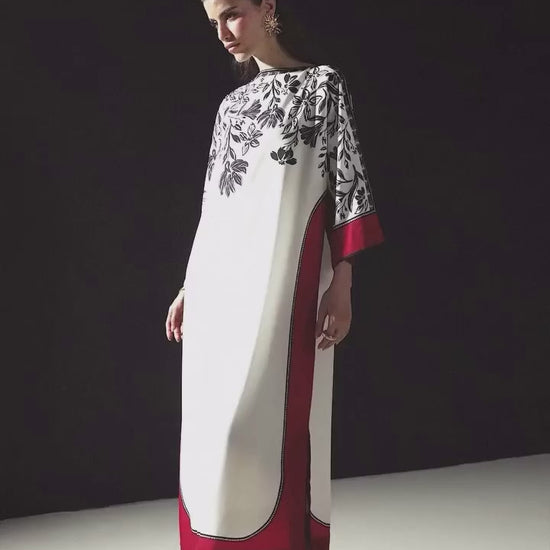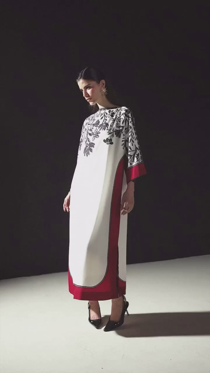 Step out in confidence with this exquisitely designed full-length Dress, where comfort meets couture. This piece is a masterclass in elegant simplicity, featuring a crisp Ivory White body beautifully framed by a bold Deep Crimson contrast border. The rich textural Premium Matty fabric ensures a stunning drape that moves gracefully with you.