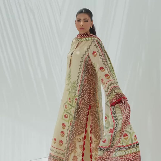 Step out in elegance with the "Desert Bloom" 3-piece ensemble, a perfect blend of traditional patterns and contemporary flair. This stunning suit features a long, flowing kurta crafted from Georgette Chiffon lined with 100% Viscose, offering a beautiful drape and comfortable feel.