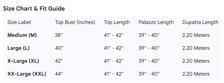 | 📐 Length | Top Length:41-42Inch, Plazzo Length:39-40 Inc, Dupatta Length: 2.20 Meter |
