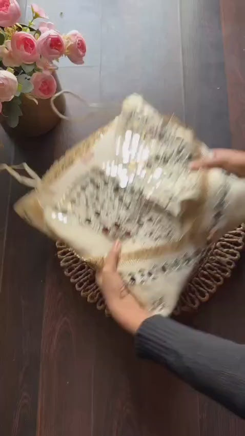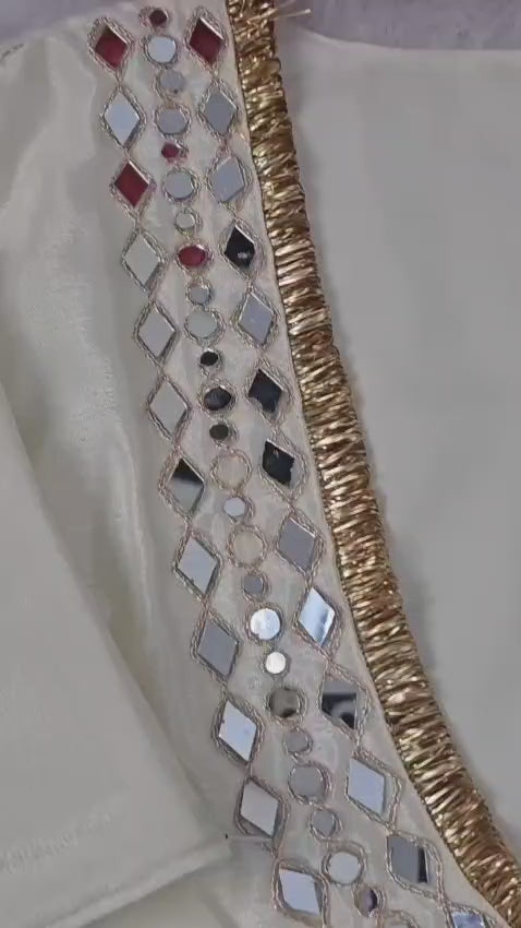 Exquisite Mirror Work: The bustier is heavily adorned with Real Mirror Work and delicate Zari embroidery, creating a shimmering effect that captures the light beautifully.