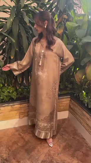Design Details The neckline is meticulously detailed with authentic mirror work and delicate tassel accents, catching the light with every movement. Intricate cream-toned geometric and floral motifs are digitally printed across the bodice and sleeves, leading down to the standout organza-style patchwork on the trouser hems.