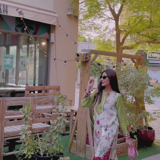 The dress features a gorgeous blend of heritage prints, with an olive green yoke and sleeves that transition into a creamy bodice adorned with delicate floral and botanical motifs. A bold deep red and moss-green patterned hem provides a striking finish. The relaxed, floor-length silhouette and soft fabric make it a perfect piece for everything from casual day outings to festive gatherings.
