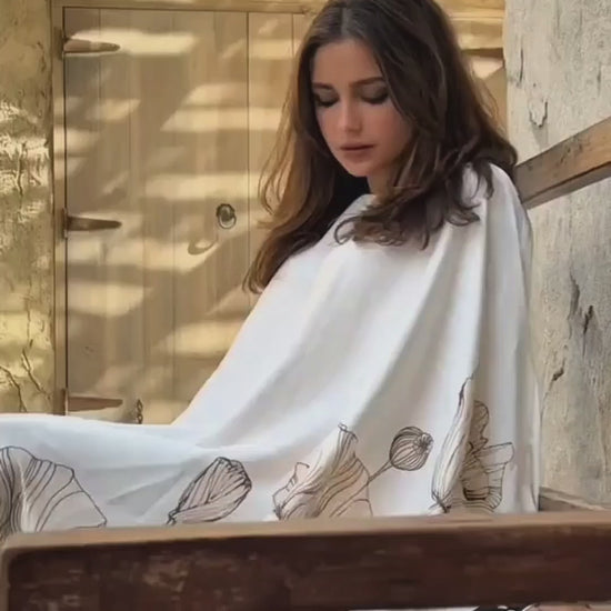 Exude understated elegance with this flowing kaftan, crafted from luxurious double georgette for a refined, lightweight drape. The ivory base serves as a canvas for delicately sketched floral motifs, rendered in soft neutral tones that highlight the artistry of minimal design. Bold black borders along the hem and sleeves add a touch of modern sophistication, perfectly balancing tradition with contemporary appeal.