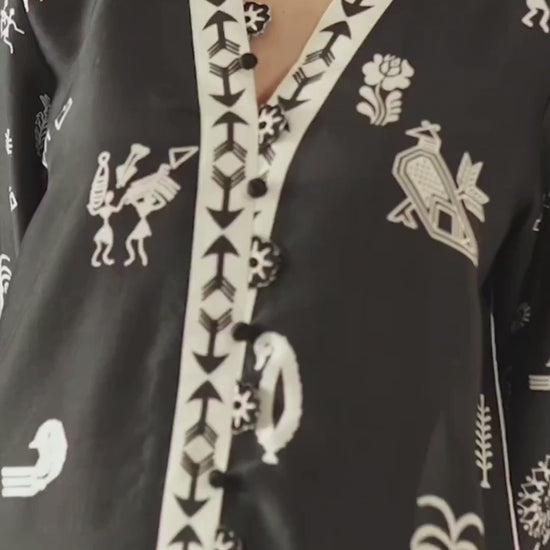 Design: A bold, two-tone design featuring a dramatic split-print. The left half showcases intricate white folk-art motifs on a deep black background, while the right half mirrors the pattern with black motifs on a clean white backdrop.