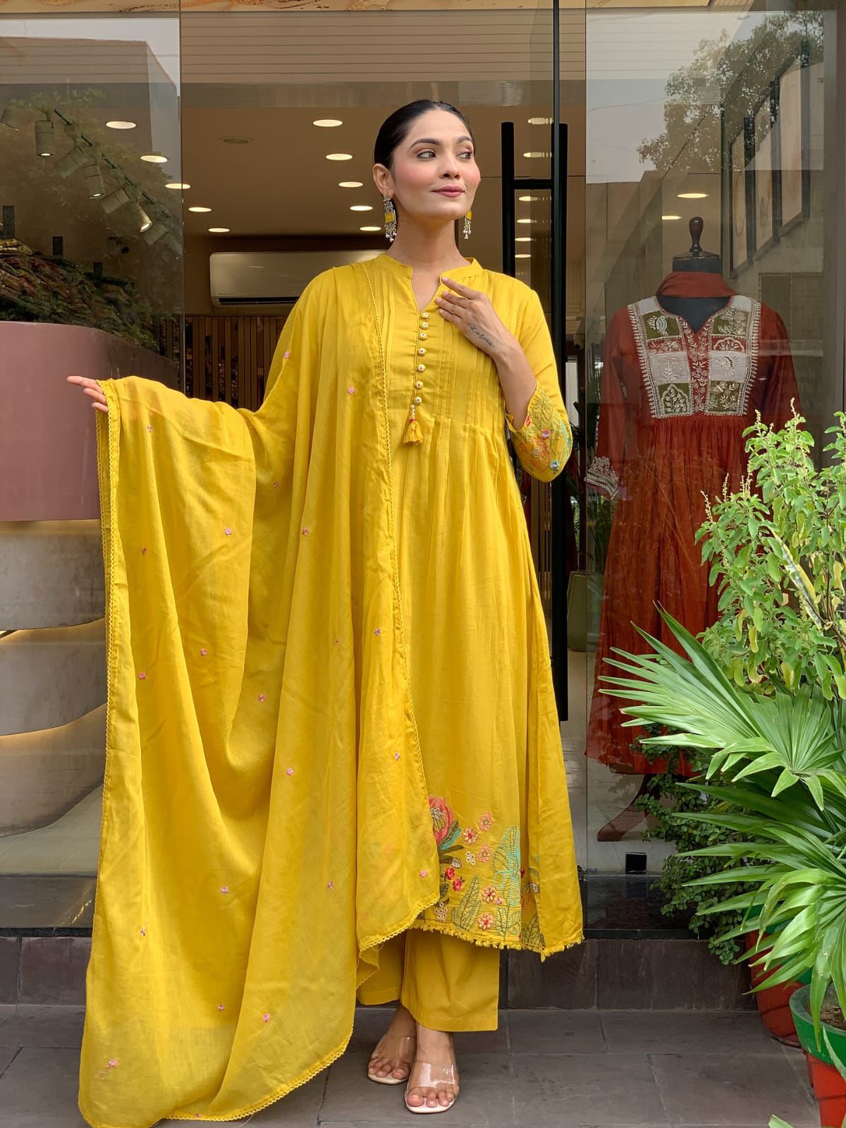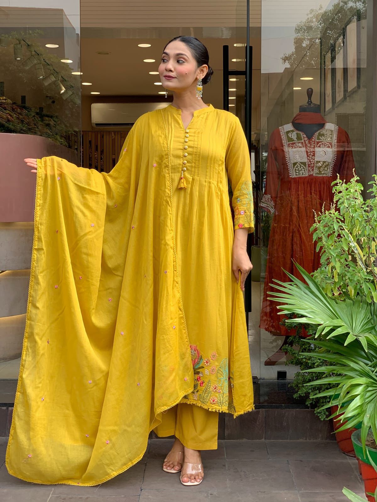 Style Tip: Pair with gold jhumkas and transparent heels (as seen in the image) for a chic, elongated look.