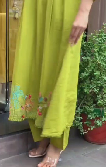 Embrace effortless grace in our Radiant Citron suit set. Crafted from premium Chanderi Silk, this outfit is a masterclass in understated luxury. The sleeves and hemline showcase gorgeous multi-colored embroidery that adds a pop of artistic flair to the vibrant lime base.